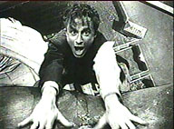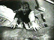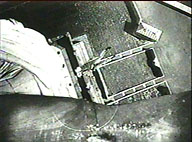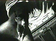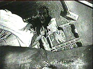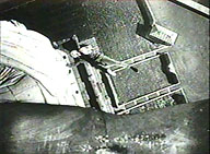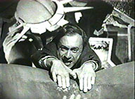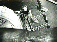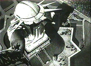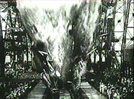 さぁ行きましょう名カット。どうやらトラベリングマットで手前の像と、落下する人物を切取り、背景と合成している様ですが、1〜4で人物の上を影がよぎる等、現実感を持たせるべく、細心の注意が払われています。6で人物が殆ど倒立しかけている事からみて、落下する人物は腰の部分で釣り下げられ、天井に向って引き上げられている処を撮影しているみたいです。素晴らしいアイディアと、撮影、合成、操演が一体化した名シーン。