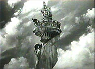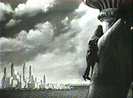 Bは実物大セットに遠景のニューヨークの町並みと海面をマット合成。ダイナミックな積雲と、石柱を想わせる高層ビルのマット画が、不思議な様式美を醸し出します。海面は勿論ちゃんとさざなみを立てる実写ですが、この映画の海面、本当の海じゃなくてセットプールでの撮影じゃないかな?波のスケール感が実際の海面と異なってます。